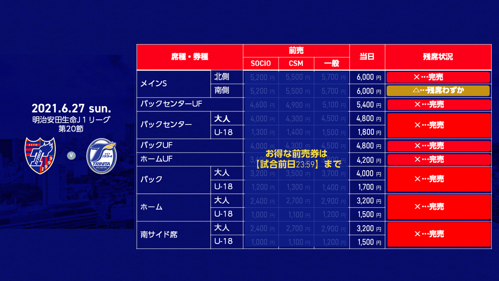 ※Am Spieltag werden am Veranstaltungsort keine Tageskarten verkauft. Der Verkauf erfolgt ausschließlich über Ticket FC Tokyo (J.League Ticket).