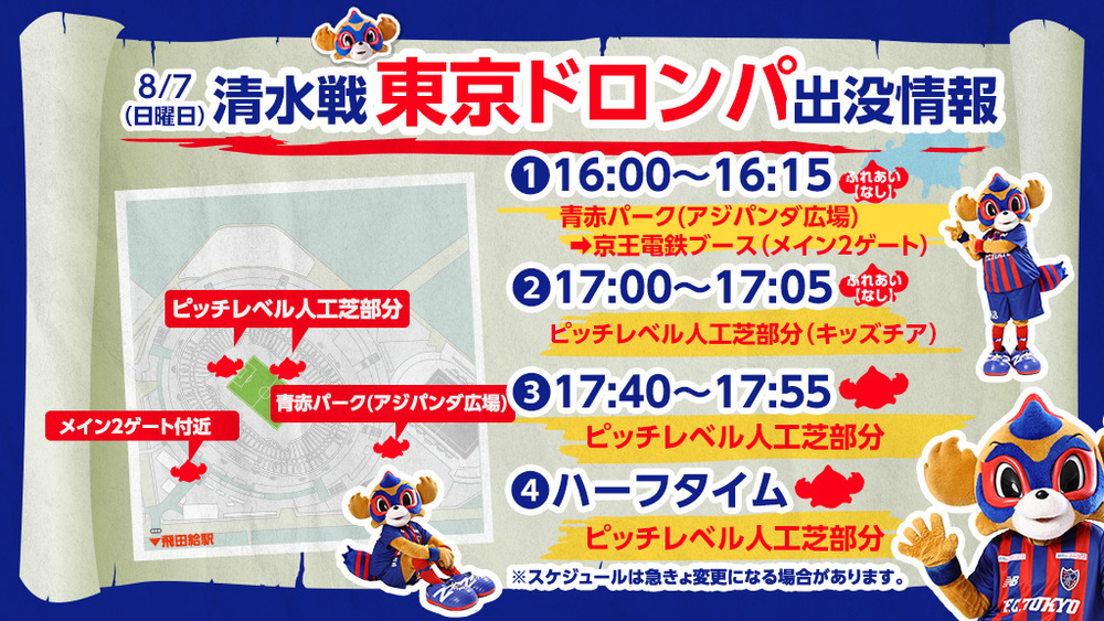 (1) 16:00–16:15 → AO-AKA PARK Ajipanda-Platz → Keio Electric Railway Stand (in der Nähe des Hauptkonkurses 2 im Stadion)※ Kein Kontakt