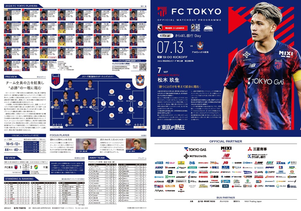 Zum offiziellen Matchday-Programm für den 23. Spieltag der Meiji Yasuda J1 League 2024 am Sa., 13.07. gegen Albirex Niigata (Anpfiff 19:00 / Japan National Stadium) informieren wir Sie wie folgt.