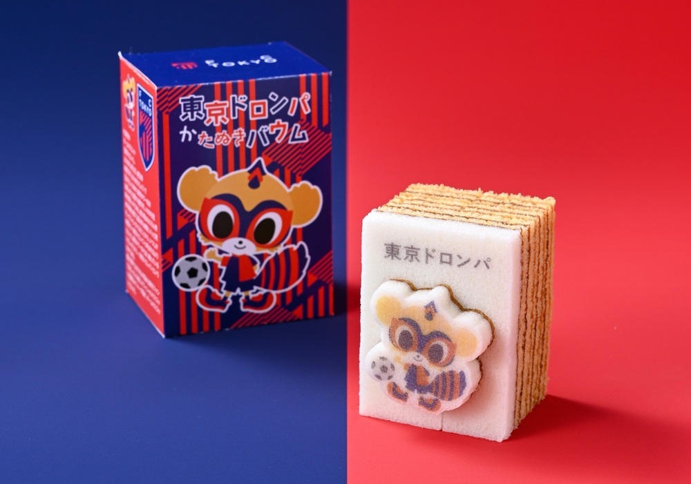 Die Baumkuchen-Spezialität "Katanukiya", bei der man beim Essen Formen ausstanzt, hat in Zusammenarbeit mit FC Tokyo ein Produkt entwickelt! Das Maskottchen des Teams, TOKYO DOROMPA, ist niedlich geformt – ein perfektes Fotomotiv-Süßigkeit beim Spielbesuch und auch ein ideales Souvenir!