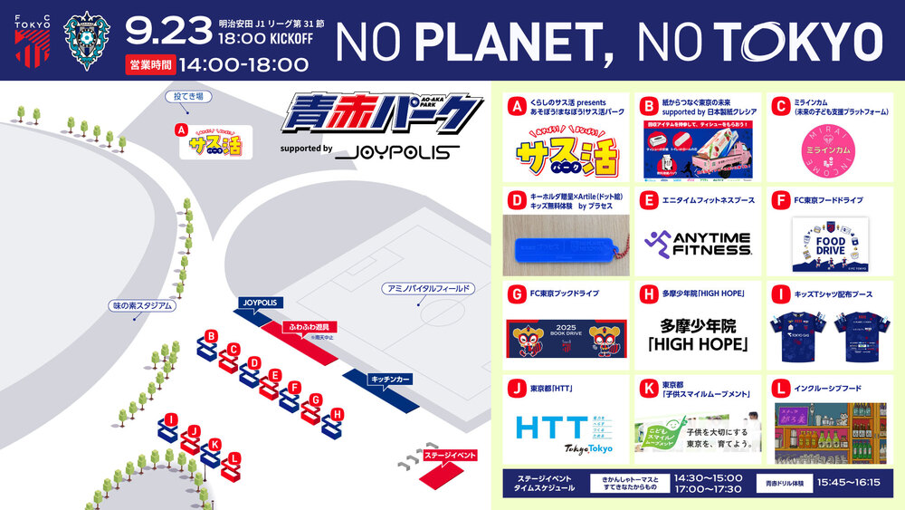 Di., 23.09.2025 (Feiertag) 2025 Meiji Yasuda J1 League 31. Spieltag vs Avispa Fukuoka (18:00 Anpfiff / Ajinomoto Stadium) findet die Veranstaltung „NO PLANET, NO TOKYO“ statt.