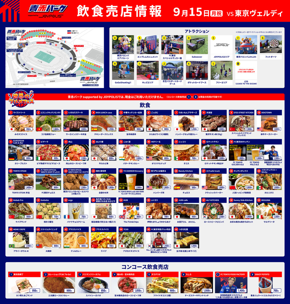 Mo., 15.09. (Feiertag) 2025 Meiji Yasuda J1 League 29. Spieltag vs Tokyo Verdy (Anpfiff 19:00 / Ajinomoto Stadium), hiermit informieren wir Sie über die Speisen- und Getränkeangebote im AO-AKA PARK supported by JOYPOLIS (außerhalb des Stadions), dem mobilen AO-AKA PARK supported by JOYPOLIS sowie den Verkaufsständen im Stadioninnenbereich (Innenraum).