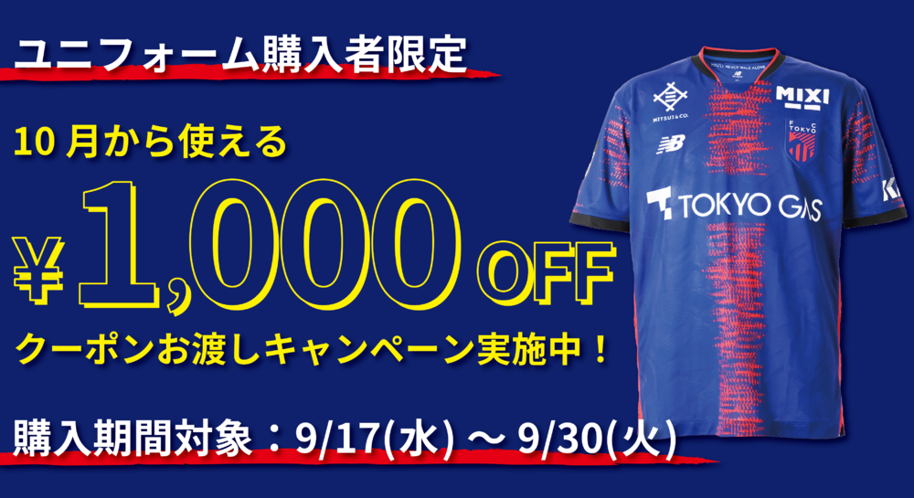 Kunden, die im Zeitraum von Mi., 17.09.2025 17:00 bis Di., 30.09.2025 23:59 im offiziellen Onlineshop die Saisontrikots kaufen, erhalten einen 1.000 Yen Rabattgutschein, der ab Oktober verwendet werden kann!