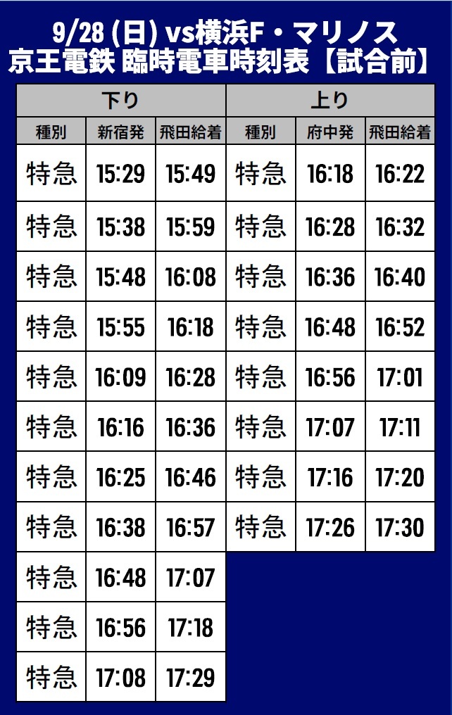 Am So., 28.09.2025, im Rahmen der 32. Runde der Meiji Yasuda J1 League gegen Yokohama F.Marinos (Anpfiff 18:00 / Ajinomoto Stadium) informieren wir über den Sonderverkehr (Bahn), Shuttlebusse und Linienbusse.