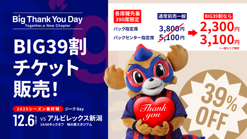 Anlässlich des "Big Thank You Day", der am Sa., 06.12. im Spiel gegen Albirex Niigata stattfindet, verkaufen wir exklusiv für dieses Spiel die "BIG39 Rabatt-Tickets"! Als Dank für Ihre Unterstützung in dieser Saison können Sie Tickets für bestimmte Bereiche, die mit "39 (Thank you)" in Verbindung stehen, in begrenzter Stückzahl und nach dem Prinzip "Wer zuerst kommt, mahlt zuerst" mit etwa 39 % Rabatt erwerben! Bitte sichern Sie sich Ihre Tickets frühzeitig!