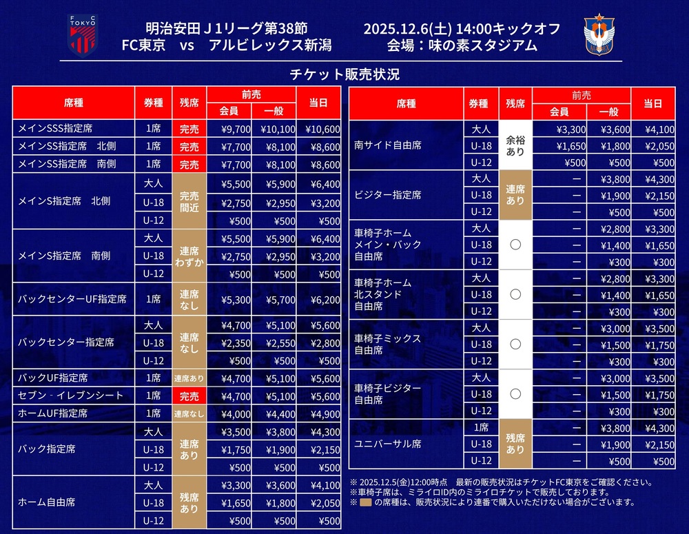 Zum Tageskassenverkauf für das Spiel der 38. Runde der Meiji Yasuda J1 League 2025 FC Tokyo vs Albirex Niigata (Anpfiff 14:00 / Ajinomoto Stadium) informieren wir Sie wie folgt.