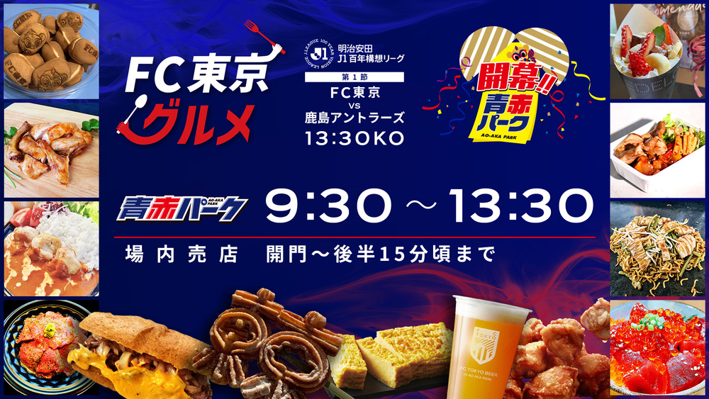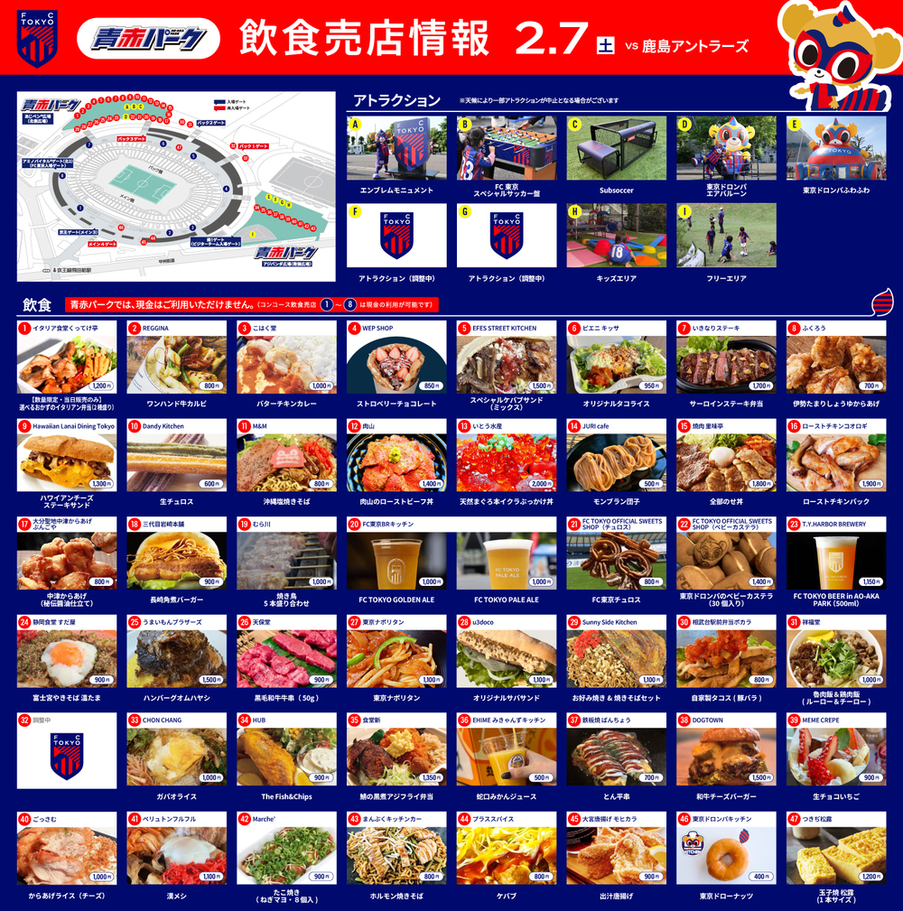 Am Sa., 07.02., im ersten Spiel der Meiji Yasuda J1 Hundred Year Vision League gegen die Kashima Antlers (Anpfiff 13:30 / Ajinomoto Stadium) informieren wir Sie über Speisen und Getränke, die im AO-AKA PARK (außerhalb des Stadions), im mobilen AO-AKA PARK sowie an den Verkaufsständen im Innenbereich des Stadions angeboten werden.