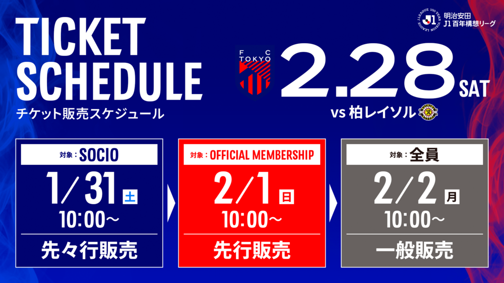 We would like to inform you about ticket sales for the Meiji Yasuda J1 Century Vision League Sec. 4 match vs Kashiwa Reysol on Saturday, February 28 (3:00 p.m. kickoff / Ajinomoto Stadium).