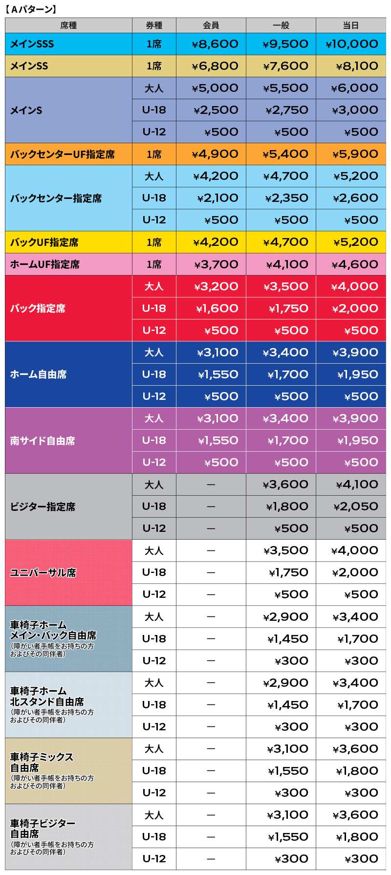 ※U-18 rates apply to those born on or after April 2, 2008, and U-12 rates apply to those born on or after April 2, 2014. Preschool children do not require a ticket if they watch on a guardian’s lap.
