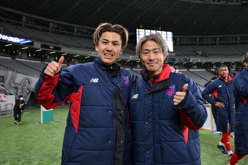 A、今の東京で負けたくないと思える選手は、(白井)康介さんかな。でも、本当に仲良しです。まずJFA・Jリーグ特別指定選手の時に参加した沖縄キャンプで同部屋だったんです。そこが始まりで、仲良くさせてもらって今は練習場のロッカーも隣です。昨シーズンは自分がウイング、康介さんがサイドバックで縦関係を組む機会も多く、そこで良い補完関係も作れたと思っています。例えばゴールキックに自分が競って、戻って守備のカバーに走ることも多かったです。代わりに僕には爆発的な突破力がないので、そういうところを康介さんがオーバーラップして助けてくれた。互いにプレーで助け合えたことで良い関係性ができあがったと思います。自然と会話も増えているし、二人で食事に行く機会も多くなりました。今シーズンも2年連続沖縄キャンプで同部屋になって、オフの時は二人で離島にも出掛けました。まぁ、康介さんが2023シーズンの夏に移籍してきて、元々の知り合いや友達が少なくてなじめてなかったのがかわいそうだったので、僕が付き合ってあげているだけですけどね(笑)。