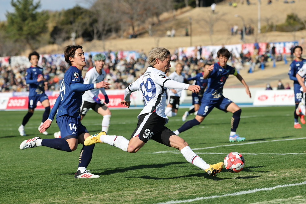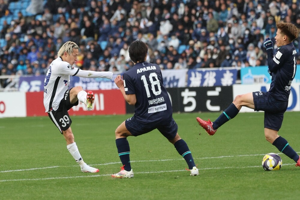 序盤は身体を張ったディフェンスを見せ、ペナルティエリア内での連続ブロックや連動したプレス、野澤大志ブランドン選手のファインセーブ、橋本拳人選手の失点寸前のクリアなど守備陣が奮闘。攻めては白井康介選手の右クロスからニアに入り込んだ仲川輝人選手が頭で巧みにコースを変えて狙い、左サイドを突破した俵積田晃太選手の折り返しに逆サイドから白井選手が詰めるシーンもあったが、全体的には攻撃で変化をつけるシーンが少ないまま時間が経過してしまう。
