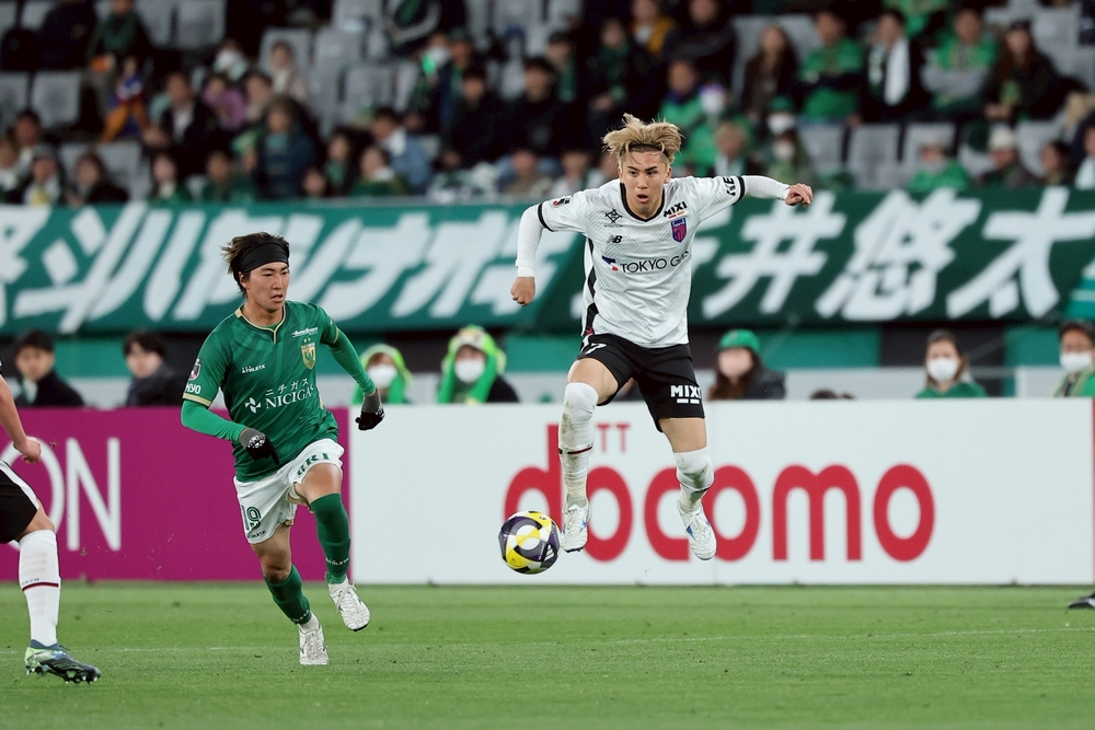 前半は最終ラインからしっかりとつないでビルドアップする東京が、相手のカウンターを警戒しながら試合を進める展開となった。キックオフ直後には高宇洋選手が高い位置でロストしたボールを即時奪回。絶対に負けられない一戦で高い集中力と勝利への意識を見せていく。