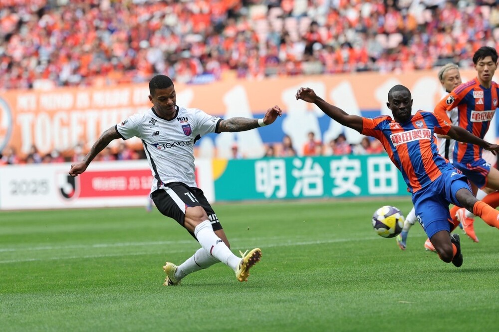 バイタルエリアで前を向いたマルセロ ヒアン選手が力強く前方へ持ち運ぶと、相手の寄せが甘くなった瞬間に左足を振り抜く豪快な一撃。背番号19が強烈なシュートをネットに突き刺し、ついに東京でのリーグ戦初得点をマークした。