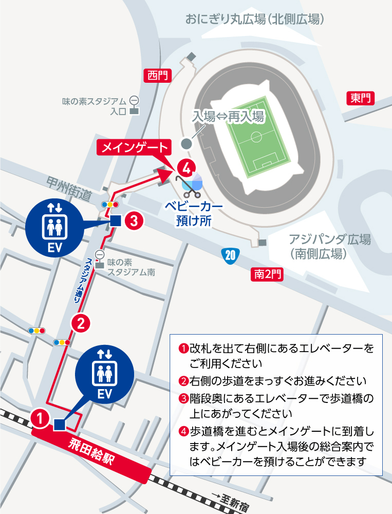 【도비타큐역에서 아지노모토 스타디움으로 입장하는 동선】
