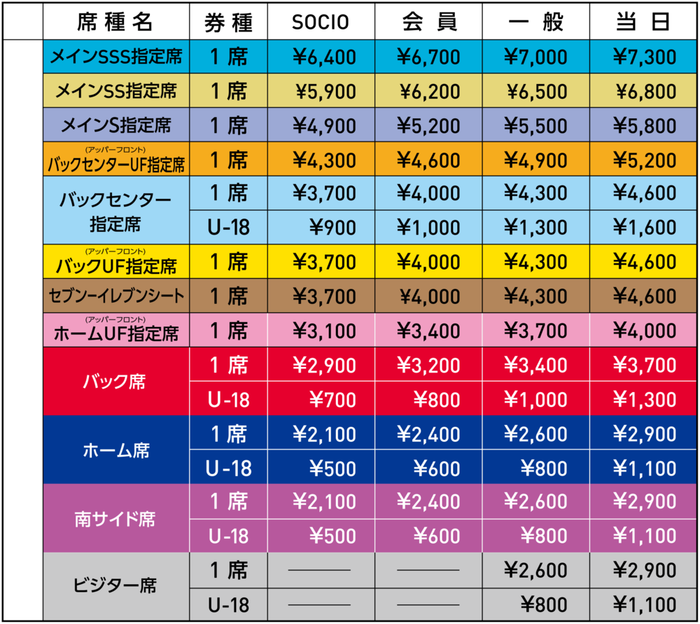 ※비지터 팀의 유니폼·굿즈 착용 및 비지터 팀 응원이 가능한 좌석 종류는 위의 「메인 SS 지정석 남측」, 「메인 S 지정석 남측」, 「비지터석」 3종류이며, 그 외의 좌석은 모두 FC 도쿄 응원석입니다.