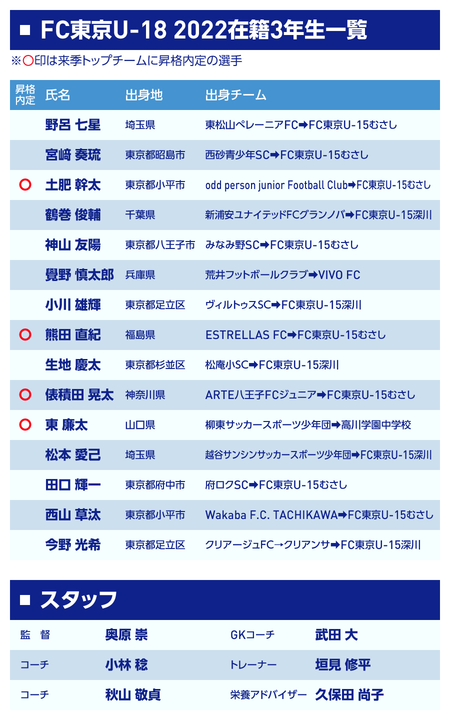 그 안에는 팀이 하나가 되는 것의 중요성과 FC 도쿄가 줄곧 소중히 여겨온 포기하지 않는 마음…… 더 나아가 피치 안팎에서의 규율과 일상 훈련에서의 태도, 학교나 집에서의 생활 등 3학년 선수들이 정말 고심하며 스스로 FC 도쿄 U-18로서의 기준을 만들어낸 성과라고 생각합니다. 그 부분이 변화한 선수들은 피치 위에서 표현할 수 있는 것도 많아졌습니다. 성장하여 모두가 성취감을 가지고 1년을 마무리할 수 있었던 것 같습니다.