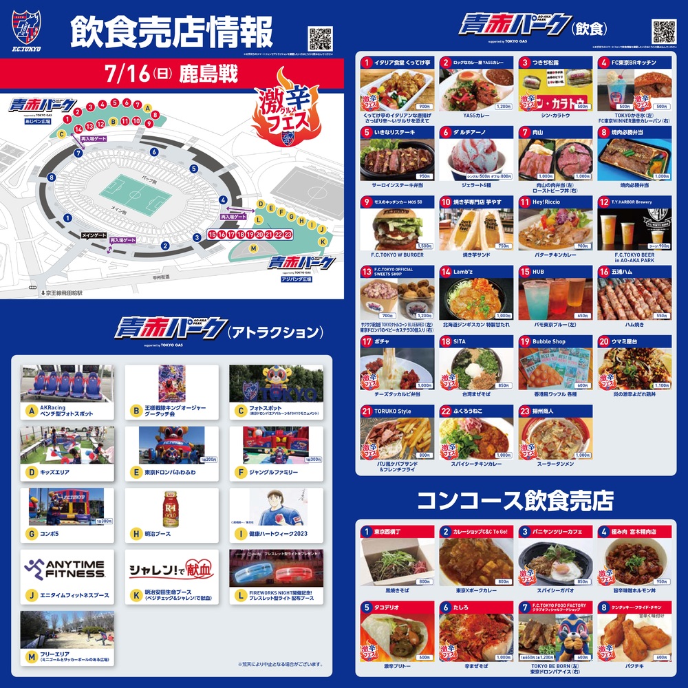 7월 16일(일) 가시마 앤틀러스전의 아오아카 파크 supported by TOKYO GAS(장외) 및 스타디움 내 콘코스(장내) 매장에서 판매하는 푸드 메뉴입니다.