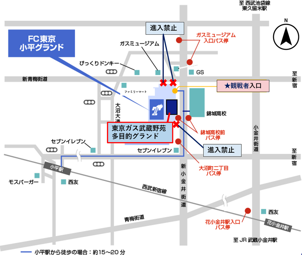 세이부 이케부쿠로선 ‘히가시쿠루메역’ 하차, 세이부 버스(21번 노선 무사시코가네이역행) ‘긴죠 고등학교 앞’ 하차, 도보 1분