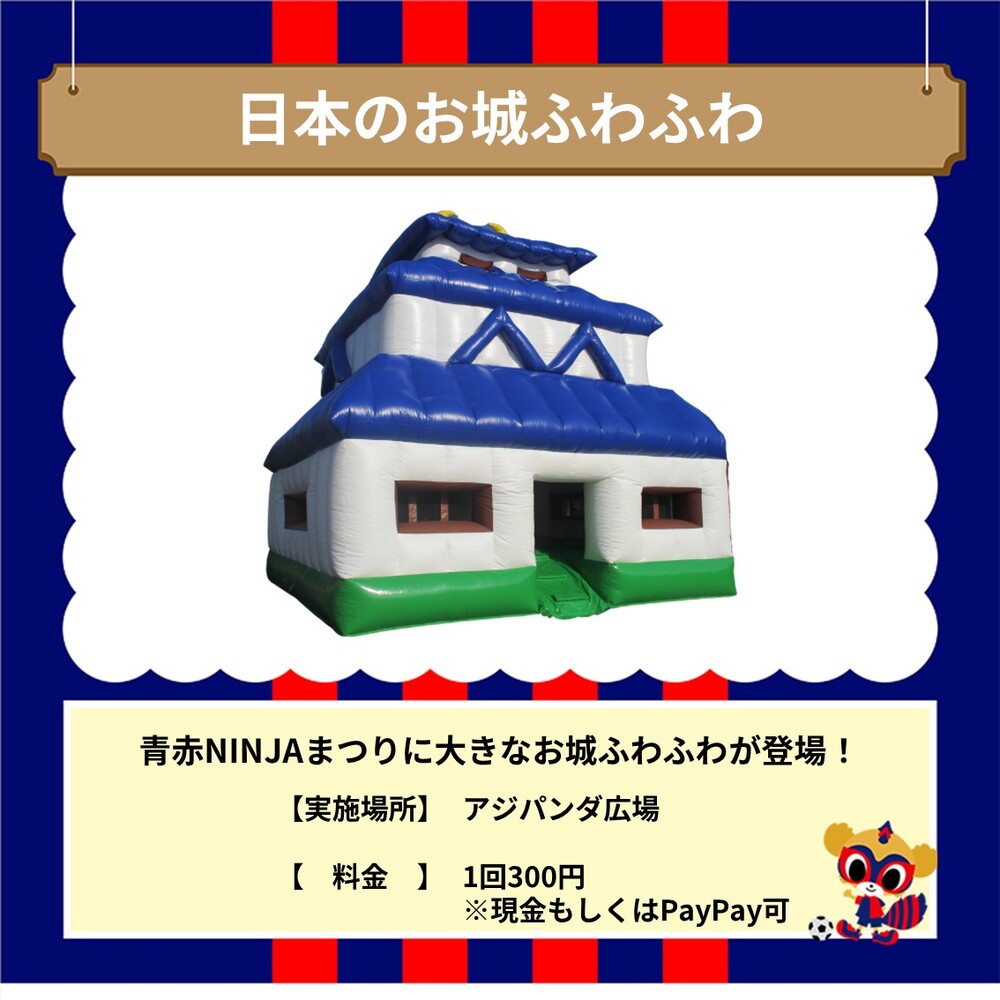 『청적NINJA 축제』에서는 NHK TV 애니메이션 『닌타마 란타로』가 방문하여 퀴즈 대회와 댄스 이벤트를 진행하는 것 외에도, 다수가 함께 싸우는 체험형 이벤트 「어린이 합전 게임」과 이아이키리, 수리검, 활쏘기 등을 즐길 수 있는 체험 부스 등을 설치합니다. 또한, 이 날 한정으로 「일본의 성 부풀림 놀이기구」도 등장! 와쇼쿠 페스로서 일본의 맛있는 음식도 준비되어 있습니다! 꼭 아오아카 파크에 방문해 주세요!