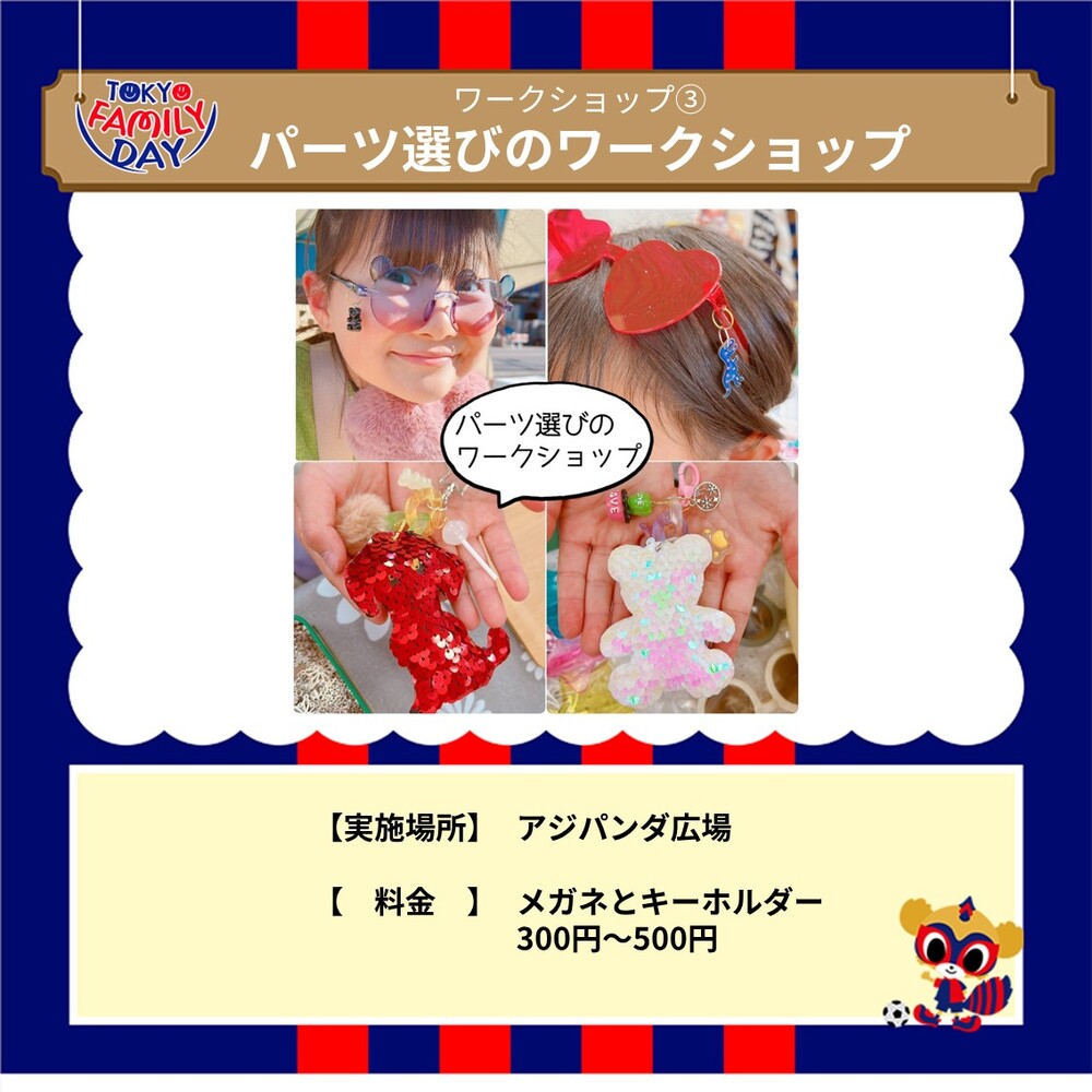 6가지 어트랙션이 등장하며, FC 도쿄 홈게임 한정 신 어트랙션을 선보입니다! 또한 귀여운 안경과 키홀더를 만들 수 있는 워크숍도 개최합니다!