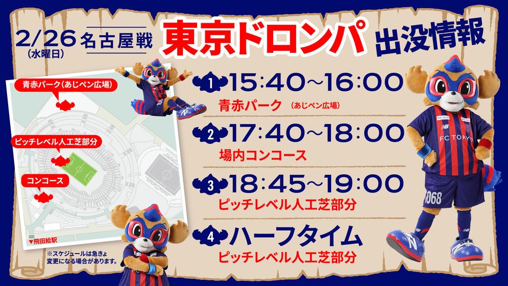 2월 26일(수) 2025 메이지 야스다 J1리그 제3절 vs 나고야 그램퍼스(19:00 킥오프/아지노모토 스타디움)에 도쿄 도롱파가 아래와 같이 출현합니다. 기대해 주세요!