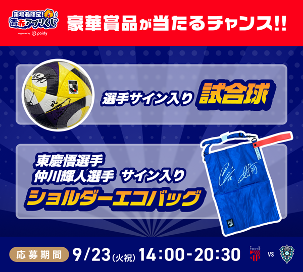 9월 23일(화공휴일) 2025 메이지야스다 J1리그 제31라운드 vs 아비스파 후쿠오카(18:00 킥오프/아지노모토 스타디움)에서 FC 도쿄 공식 앱을 활용한 방문자 한정 『청적 앱 복권 supported by Paidy』를 실시합니다.