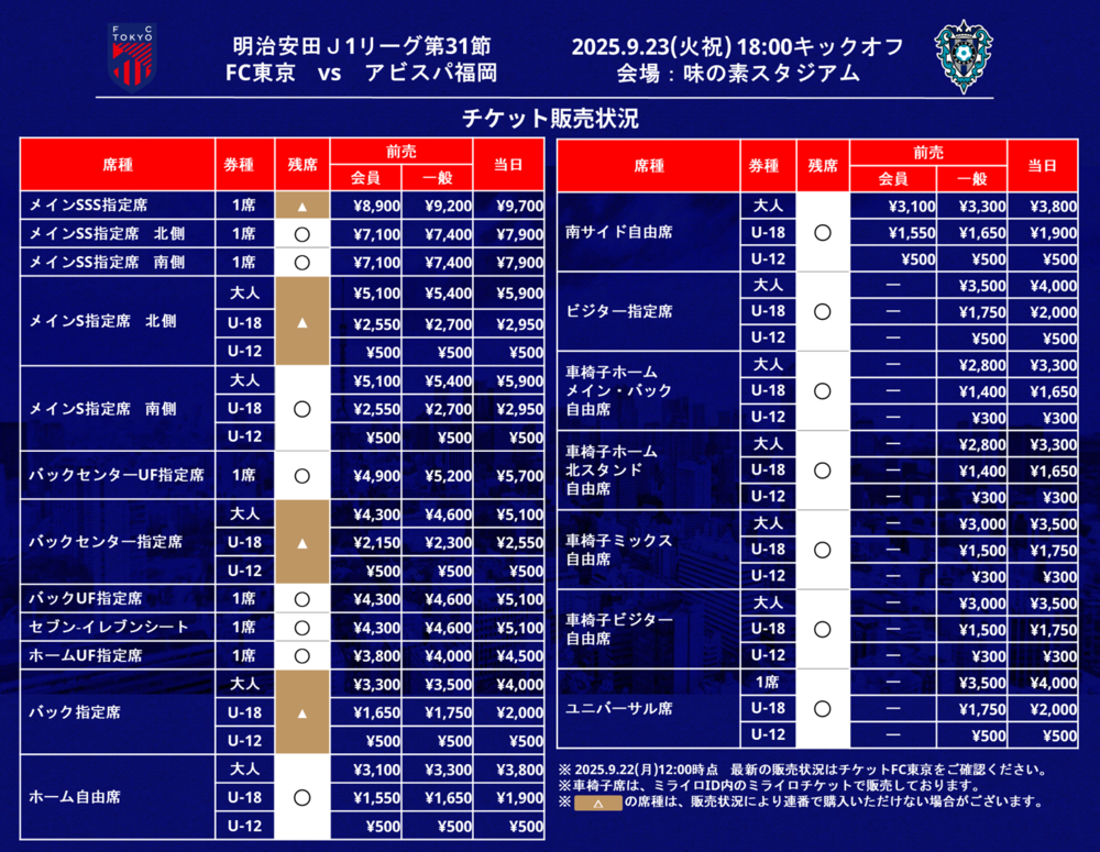 2025 메이지 야스다 J1리그 제31라운드 FC 도쿄 vs 아비스파 후쿠오카(18:00 킥오프/아지노모토 스타디움) 당일권 판매에 관하여 아래와 같이 알려드립니다.