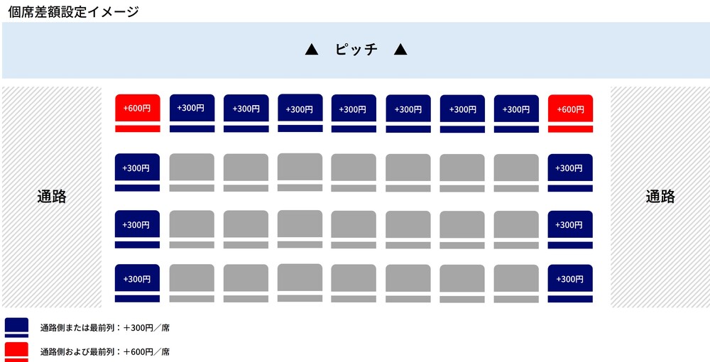 각 경기의 단일 티켓 판매 시, 지정석의 ‘통로 측’ 및 ‘맨 앞줄’을 대상으로 옵션 가격으로 개별 좌석 차액을 설정합니다.각 블록의 통로 측 또는 맨 앞줄 좌석을 구매하실 경우, 옵션 가격(+각 300엔/좌석)이 추가됩니다.
