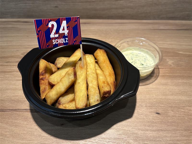 숄츠 선수의 아주 좋아하는 고구마를 사용하고, 딥 소스는 출신국 덴마크의 전통적인 렘라드 소스를 선택했습니다.