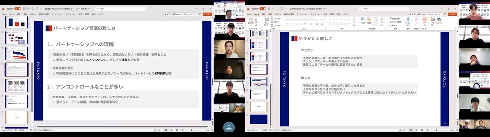 이번 스터디에서는 파트너 세일즈와 팬·서포터와의 커뮤니케이션 설계, 데이터 활용 실천 등 각 부서가 담당하는 전문 영역에 대해 강의가 진행되어, 학생 비즈니스 스태프가 평소 접할 기회가 적은 업무 지식을 폭넓게 습득하는 장이 되었습니다. 또한, 여러 부서의 시점에서 클럽 운영을 이해함으로써, 학생 자신이 담당하는 업무의 위치나 클럽 전체에서의 연계 중요성에 대해서도 이해를 깊게 하는 기회가 되었습니다.