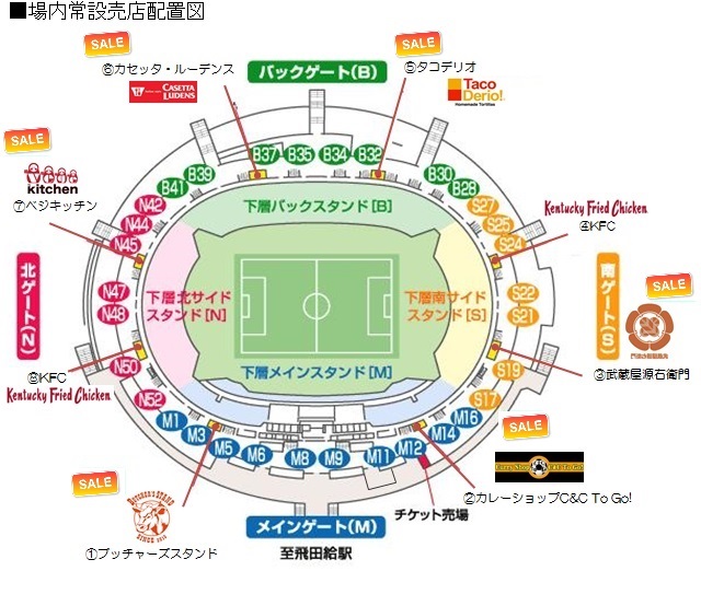 아지노모토 스타디움에서 3/14(토) vs 요코하마 F.마리노스전(14:00 킥오프)에서의 「장내 매점」과 「푸드 코너」에 관한 안내입니다.