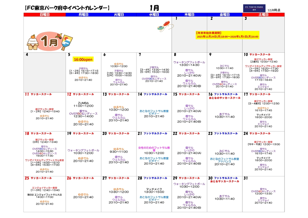 上記イベントの他、年末年始の蹴り納めも、ぜひ府中駅前すぐのFC東京パーク府中をご利用ください!