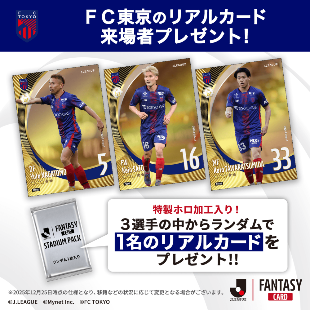 2月14日(土) 明治安田J1百年構想リーグ EASTグループ 第2節vs浦和レッズ (15:00キックオフ/味の素スタジアム)において、Jリーグ公式のデジタルトレーディングカード『J.LEAGUE FANTASY CARD』のリアルカードを来場者先着30,000名様に配布いたします。