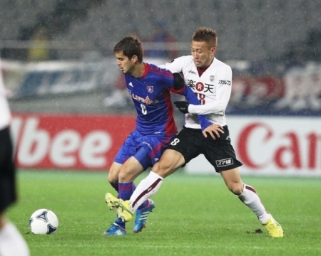 Jogador Hasegawa mantém a posse de bola apesar da marcação apertada do adversário -