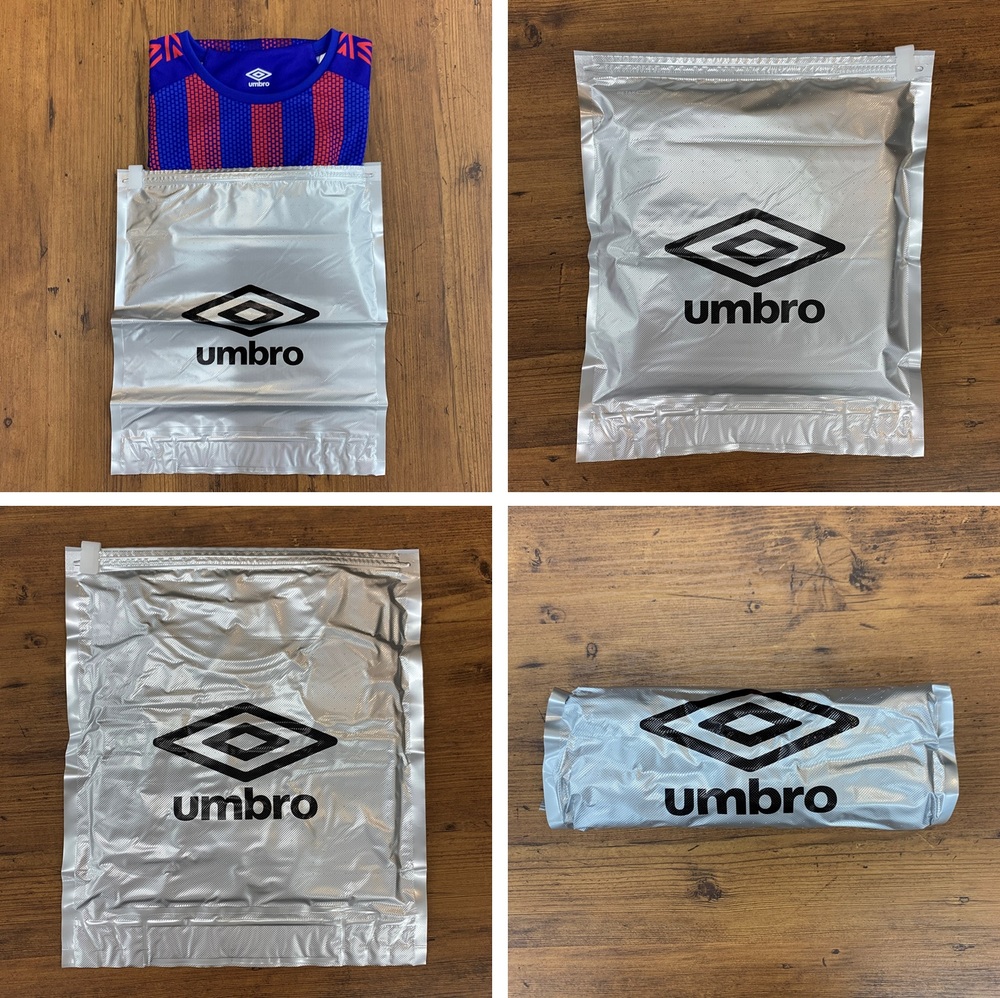 É um item muito conveniente que permite comprimir facilmente uniformes, roupas para troca e outros itens em um tamanho pequeno e compacto no dia do jogo, facilitando o armazenamento em bolsas e afins!