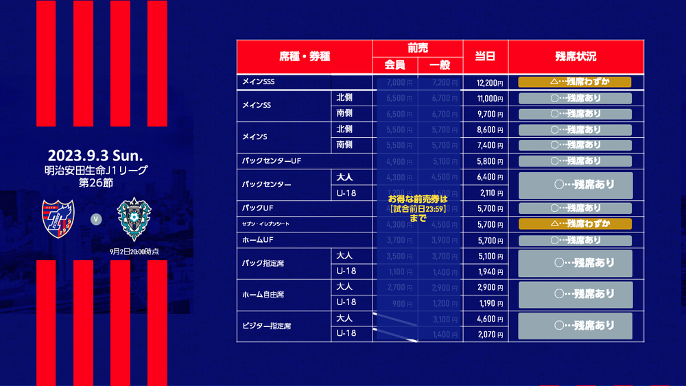 Venda de ingressos no dia para a 26ª rodada da J1 League 2023 Meiji Yasuda Life Insurance Company: FC Tokyo vs Avispa Fukuoka (início às 19:00 / Ajinomoto Stadium), conforme informado abaixo.