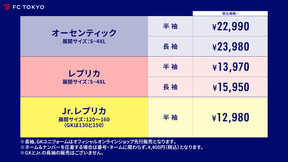 *Para os SOCIO, somente ao comprar sem nome e número durante o período de "Desconto para Nome e Número Exclusivo para SOCIO", por motivos do sistema, o preço com imposto será 2 ienes menor que o da tabela de preços.