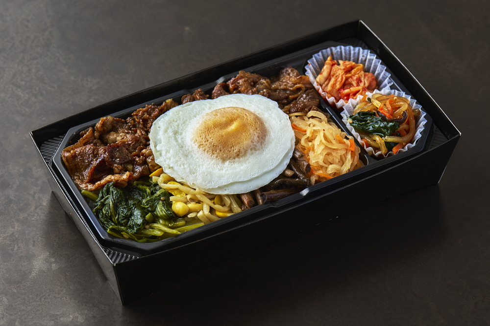 É uma marmita bibimbap repleta do charme da culinária coreana, combinando finas fatias de carne bovina grelhada com japchae, o prato favorito de Min Gyu JANG, kimchi de acelga e coloridos namul.