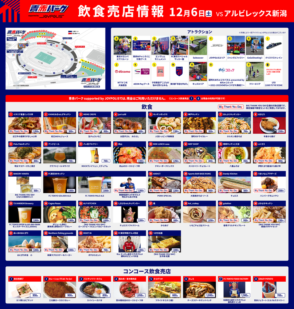 No dia 6 de dezembro (Sáb), na 38ª rodada da J1 League Meiji Yasuda 2025, partida contra Albirex Niigata (início às 14:00 / Ajinomoto Stadium), informamos sobre as opções de alimentação que estarão disponíveis na AO-AKA STREET, AO-AKA PARK supported by JOYPOLIS (fora do estádio), no AO-AKA PARK supported by JOYPOLIS itinerante e nas lojas dentro do concourse do estádio (interno).