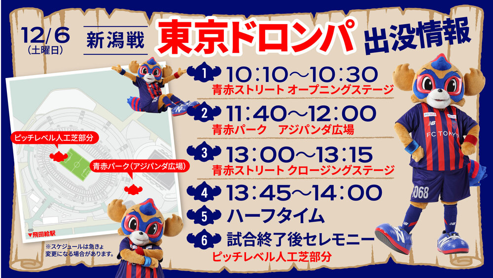06/12 (Sáb) 2025 Meiji Yasuda J1 League Rodada 38 vs Albirex Niigata (início às 14:00 / Ajinomoto Stadium) TOKYO DOROMPA aparecerá conforme abaixo.