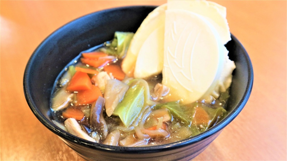 "Uma sopa de senbei rica em ingredientes, feita com senbei Nanbu e base de molho de soja! O molho penetra no senbei, criando uma textura macia e irresistível, um prato supremo!"