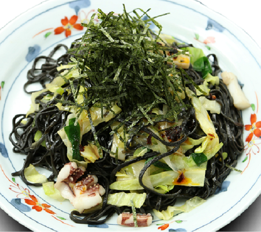 "Um prato supremo com macarrão de tinta de lula intenso e um suave molho de sal!"