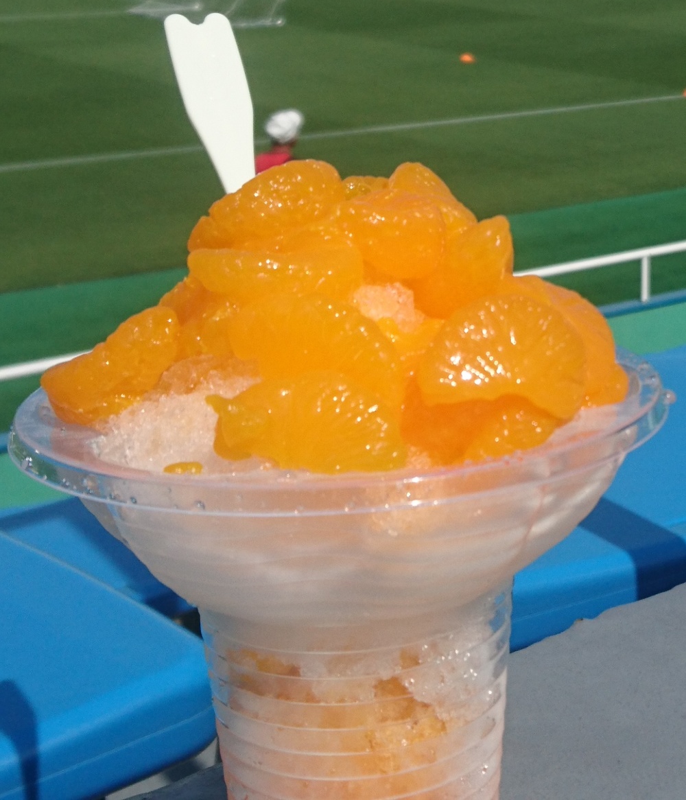 "Este é um kakigori perfeito para o verão, feito com muitas tangerinas!!"