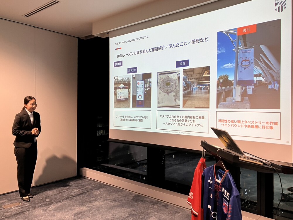 當千葉傑茲的學生實習生提問「在TOKYO GROW WITH計畫的活動中,有特別注意的事項是什麼嗎?」時,FC東京的學生商務工作人員回答說:「即使遇到不懂的事情,也不會立刻依賴公司的商務工作人員,而是重視先自主思考的態度」「在主場比賽的運營中,會從來場觀眾的視角思考如何呈現,並製作橫幅及展示用POP」等,介紹了在活動中所注意的重點。